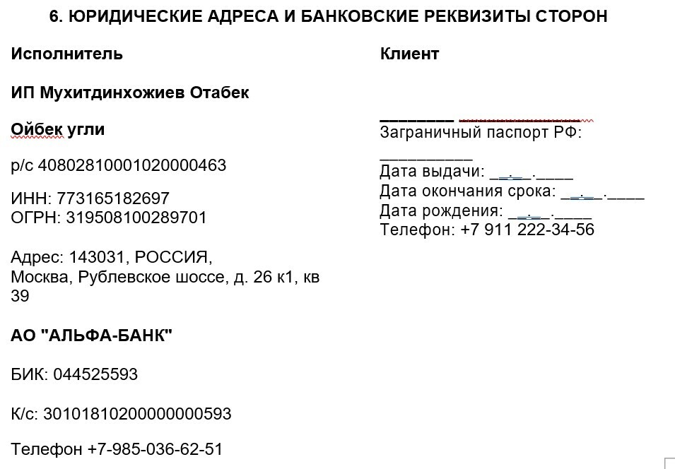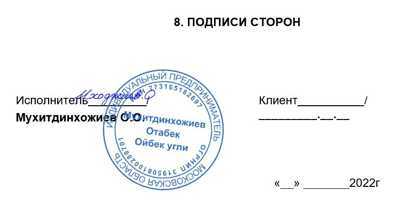 Индивидуальный Предприниматель Мухитдинхожиев Отабек Ойбек угли, действующий на основании Свидетельства ОГРНИП 319508100289701, именуемый в дальнейшем